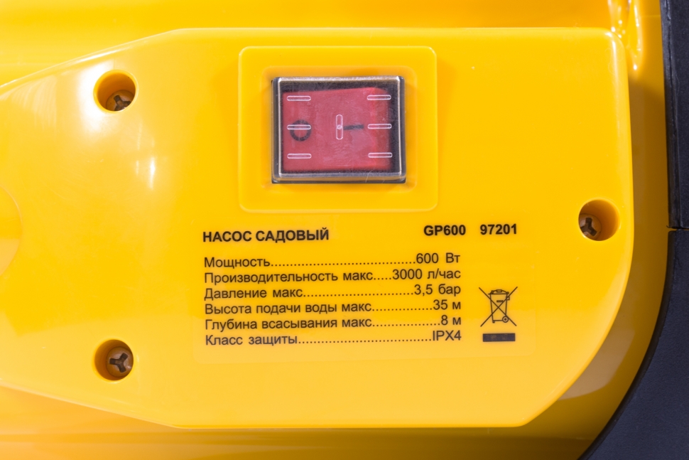 Бытовой садовый насос GP600 торговой марки DENZEL предназначен для полива садов, огородов, приусадебных участков, а также для водоснабжения жилых домов и подъёма воды на высоту до 35 м. Забор воды насосом возможен из открытых водоемов, колодцев и прочих накопительных емкостей. Максимально возможная глубина опускания всасывающего шланга — не более 8 м, максимальное давление подачи воды — 4,4 бар. Производительность насоса составляет 3000 л/час.