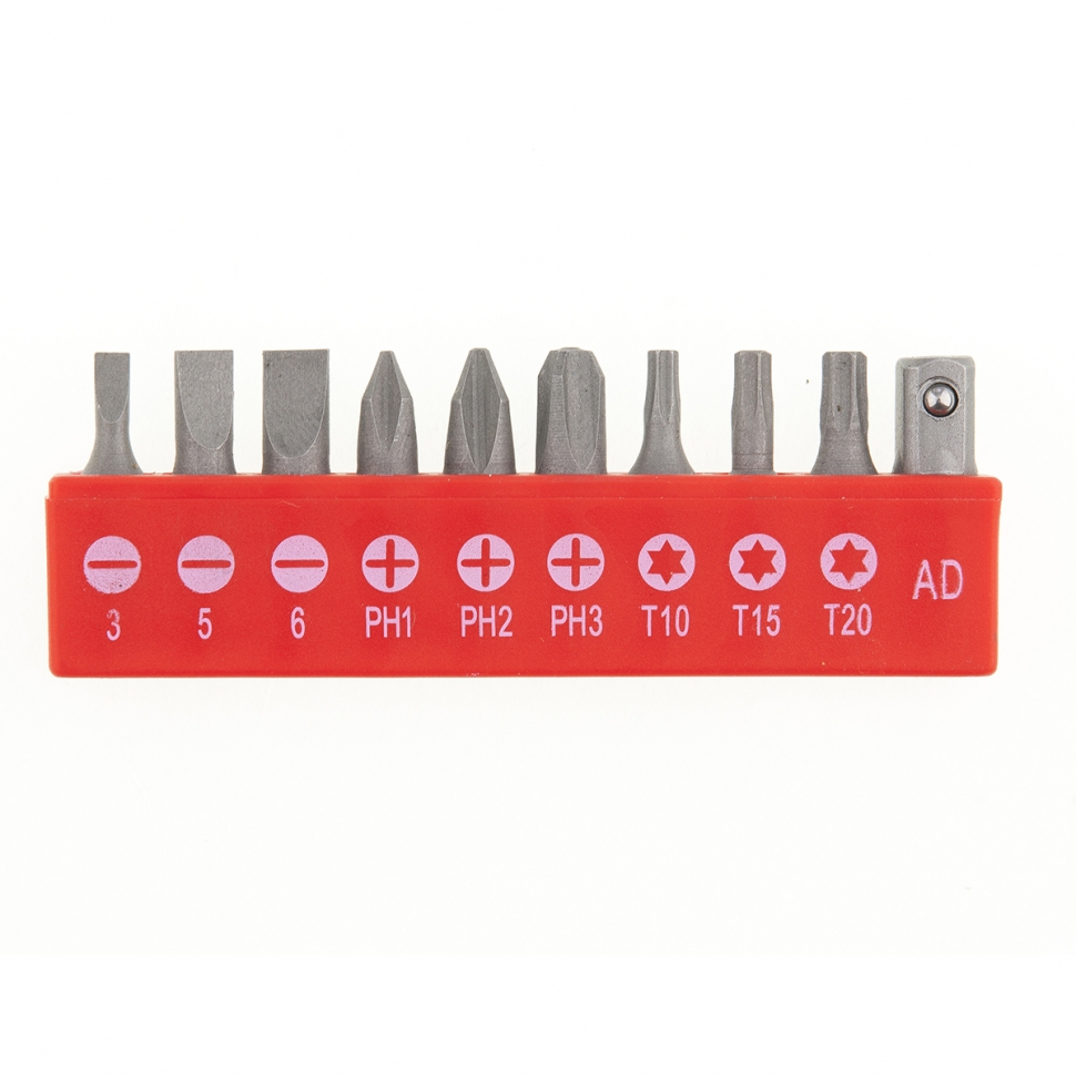 Отвертка предназначена для монтажа и демонтажа резьбовых соединений. В комплект к отвертке входят биты, изготовленные из хромванадиевой стали, с профилем SL3; SL5; SL6; РН1; РН2; РН3; Т10; Т15; Т20. Адаптер 1/4". Эргономичная 3-х компонентная рукоятка "anti slip" улучшенного дизайна обеспечивает удобный захват и эффективное вращение отвертки.