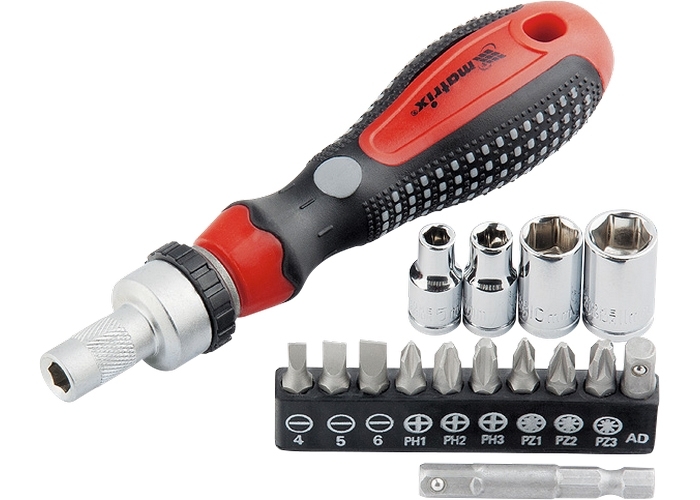 Отвертка реверсивная с набором торцевых насадок и бит. Насадки и биты изготовлены из высококачественной хромованадиевой стали. Инструмент снабжен механизмом, преобразующим возвратно-поступательное движение ручки во вращательное, что повышает производительность труда.