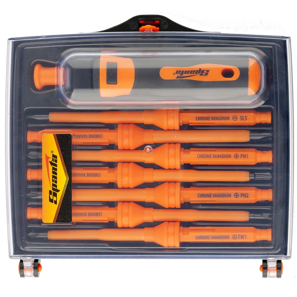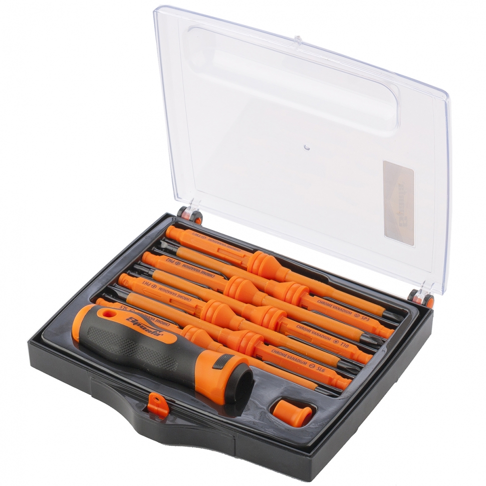 В комплект входит двухкомпонентная рукоятка с отверстием для фиксации сменных насадок, пластиковый затыльник для работы в труднодоступных местах и семь сменных насадок. Жала изготовлены из хромованадиевой стали (CrV).