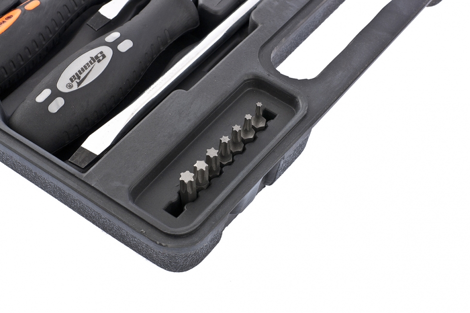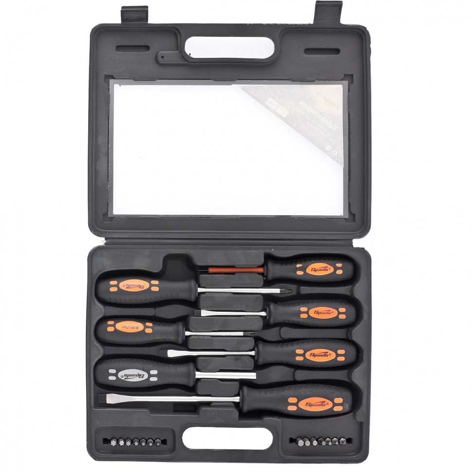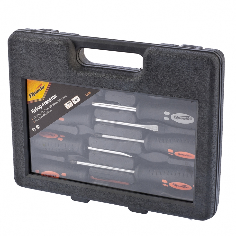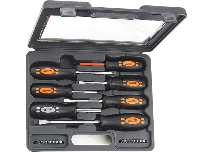 Набор предназначен для монтажа и демонтажа резьбовых соединений. Стержень изготовлен из хромванадиевой стали. Твердость рабочей поверхности – 46 HRc. Наконечник намагничен. Отвертки имеют двухкомпонентную противоскользящую рукоятку эргономичной формы с отверстием для подвески. Комплектация: отвертки с профилем SL 3 х 75, 5 х 75, 6 х 100, 7 х 150 мм, PH1 x 75, 2 x 100 мм