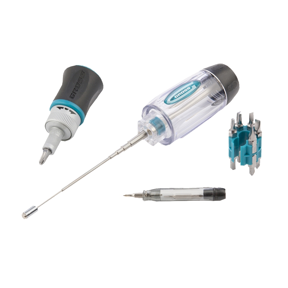 твердостью 56–58 HRC и мини-отвертка с вращающимся затыльником и двумя сменными битами.