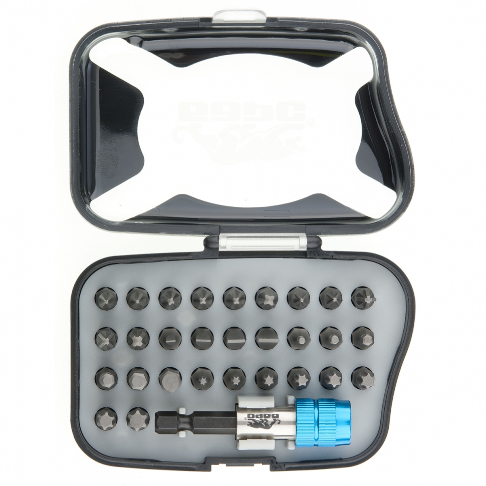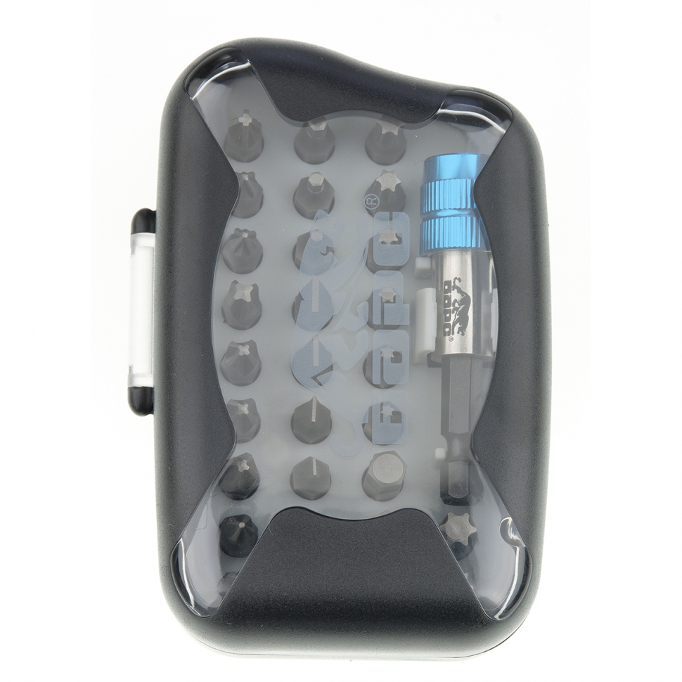 Набор бит из S2 стали. В комплект входят: биты с профилем PH1•2, PH2•3, PH3, PZ1•2, PZ2•2, PZ3, SL3, SL4.5, SL5.5, SL6.5, T9, T10, T15, T20, T25, T27, T30, T40, H2, H2.5, H3, H4, H5, H6.Твёрдость бит: 60 HRC.