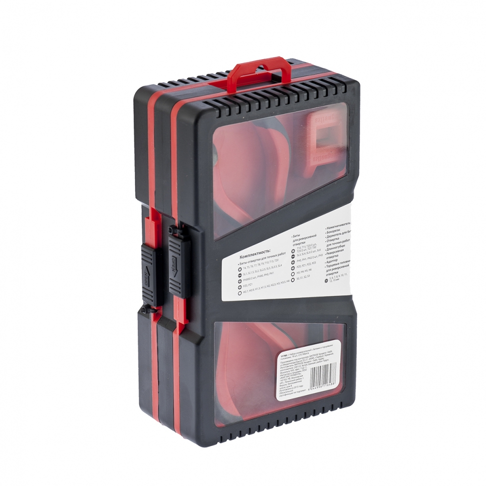 биты для реверсивной отвертки: SL3, SL 4, SL5 2 шт., SL6; T10, T15; T20 2 шт., T25 2 шт., T27, T30, T20 2 шт., T25 2 шт., T27, T30, T20 2 шт., T25 2 шт., T27, T30; РН0, РН1, РН2 2 шт., РН3; РZ0 , РZ1, РZ2, РZ3; Н3, Н4 , Н5, Н6; S0, S1, S2, S3;