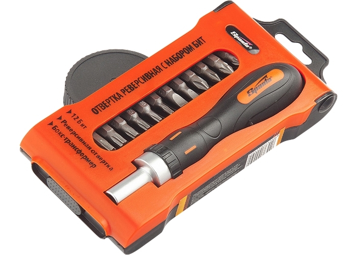Отвертка реверсивная с двухкомпонентной эргономичной рукояткой. Реверсивный механизм дает возможность работать не перехватывая рукоятку, что обеспечивает более высокий крутящий момент и позволяет максимально снизить физическое напряжение. Биты (25 мм) изготовлены из хромованадиевой стали. Комплектация: РН № 1, 2; SL 5.5, 6; РН № 1, 2; Т 10, 15, 20, 30, 40. Реверсивная отвертка – 1 шт. Бокс-трансформер – 1 шт.