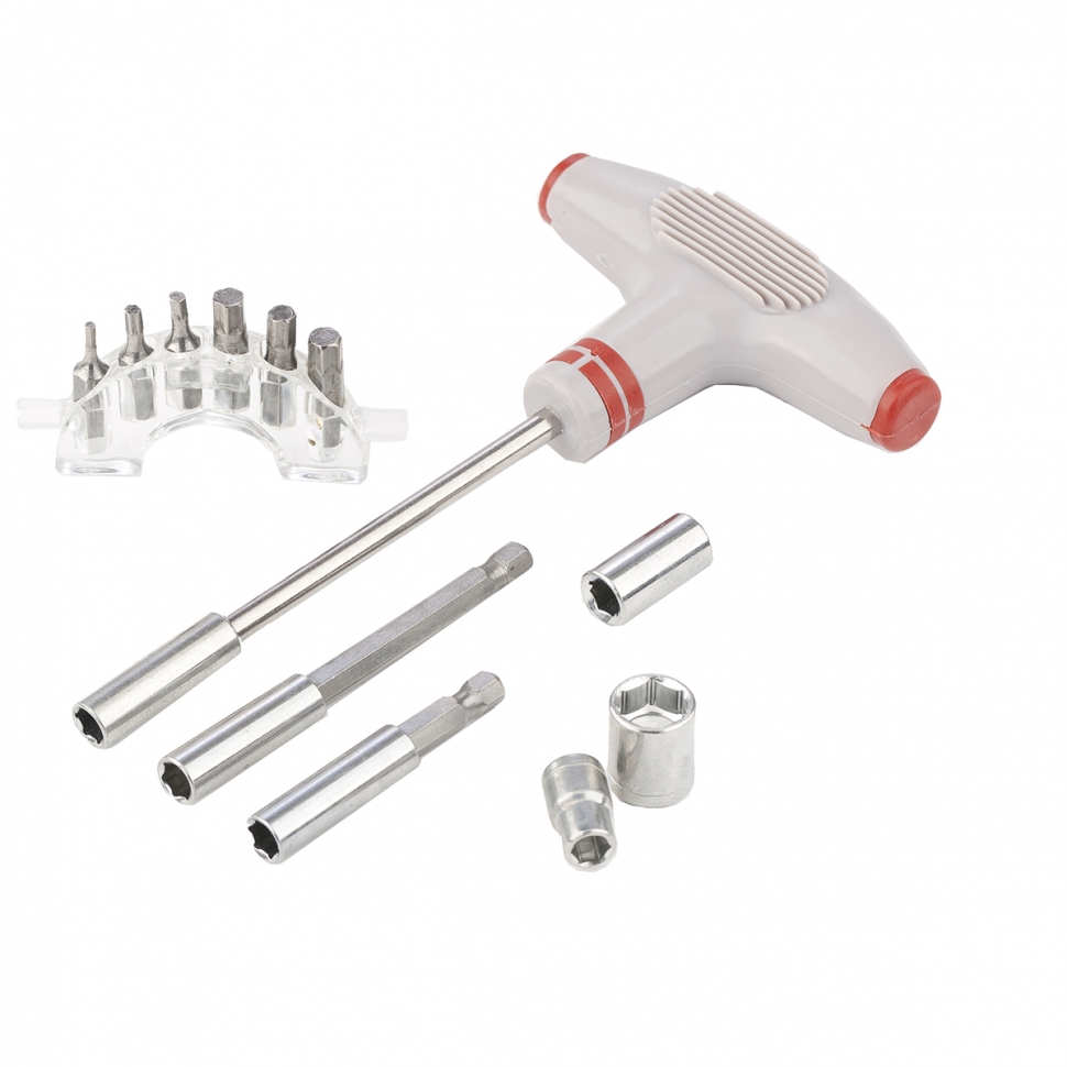 Отвертка предназначена для монтажа и демонтажа резьбовых соединений. Эргономичная Т-образная ручка инструмента улучшенного дизайна удобна для работы с усилием. В комплект к отвертке входят биты, изготовленные из хромванадиевой стали, длиной 25 мм с рабочими профилями SL, Phillips и Torx, головками – 4, 6, 7, 8, 9, 10, 11, 12 мм. Для удобства хранения и транспортировки отвертка с набором головок и бит упакована в пластиковый кейс.