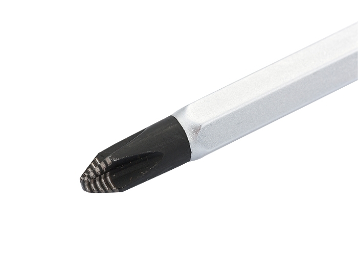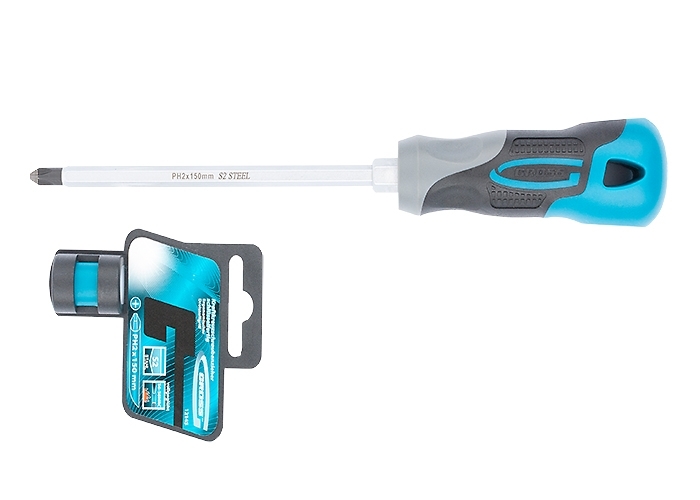 Отвертка торговой марки GROSS изготовлена из высококачественной инструментальной стали S2. Предназначена отвертка для монтажа/демонтажа резьбовых соединений с крестообразным типом шлица (PH2). Насечки на жале увеличивают трение между отверткой и шлицом крепежа, что исключает возможность повреждения шлица. На стержень отвертки длиной 150 мм нанесено хромовое защитное покрытие, которое защищает металл от коррозии. Трехкомпонентная рукоятка длиной 109 мм, имеющая запатентованную форму, удобно и надежно фиксируется в руке. Твердость рабочих частей отвертки (стержень, рукоятка) составляет 56 HRC, максимально крутящий момент затяжки — 8,2 H*m. Снабжена отвертка подвесной картой, удобной для размещения инструмента на стенде.