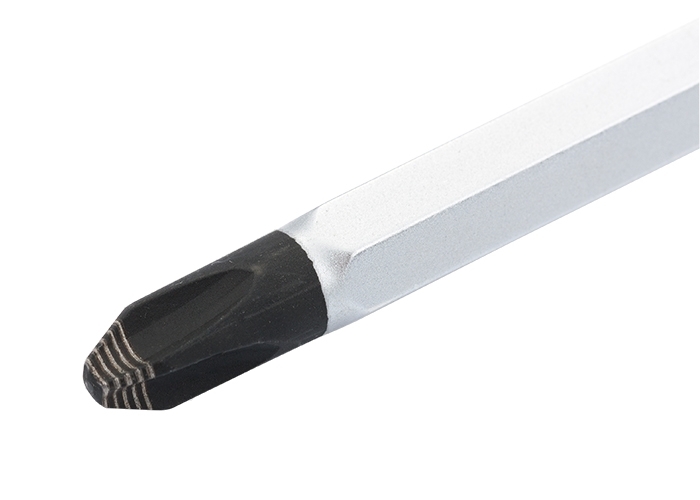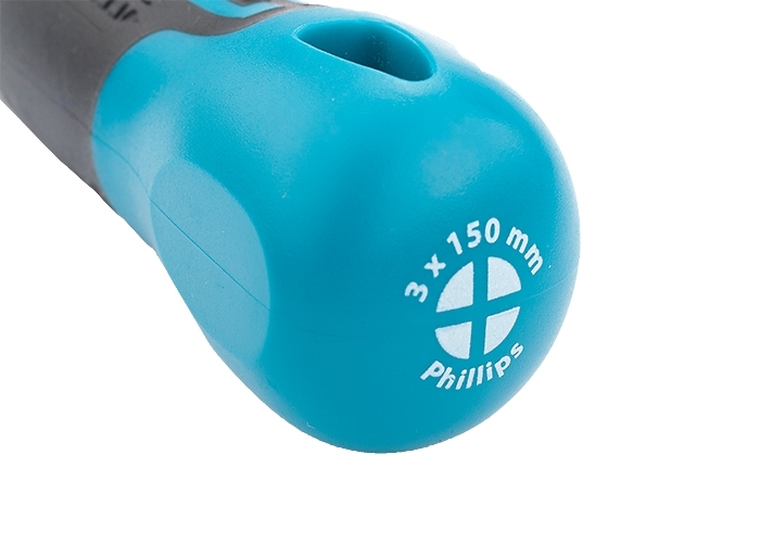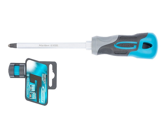 Отвертка торговой марки GROSS изготовлена из высококачественной инструментальной стали S2. Предназначена отвертка для монтажа/демонтажа резьбовых соединений с крестообразным типом шлица (PH3). Насечки на жале увеличивают трение между отверткой и шлицом крепежа, что исключает возможность повреждения шлица. На стержень отвертки длиной 150 мм нанесено хромовое защитное покрытие, которое защищает металл от коррозии. Трехкомпонентная рукоятка длиной 119 мм, имеющая запатентованную форму, удобно и надежно фиксируется в руке. Твердость рабочих частей отвертки (стержень, рукоятка) составляет 56 HRC, максимально крутящий момент затяжки — 19,5 H*m. Снабжена отвертка подвесной картой, удобной для размещения инструмента на стенде.