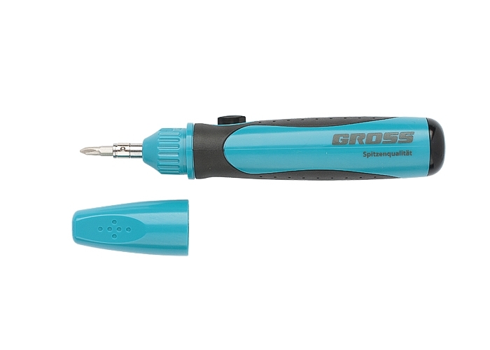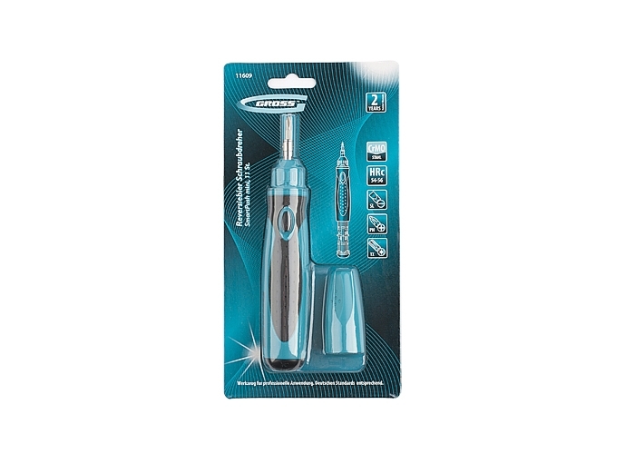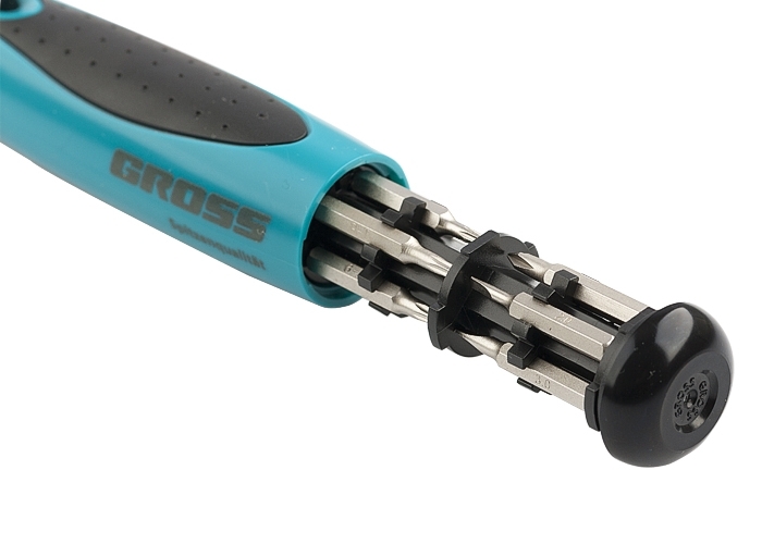 Профессиональная отвертка Gross предназначена для работ с мелкими деталями. Эргономичная рукоятка имеет форму, облегчающую работу с небольшими винтами. Реверсивный механизм позволяет без труда закручивать винты и саморезы. Биты изготовлены из высококачественной стали CrMO твердостью 54-56 HRc, намагничены. Отвертка оборудована механизмом. Отвертка оборудована механизмом SmartPush для извлечения битодержателя из скрытой полости внутри рукоятки
