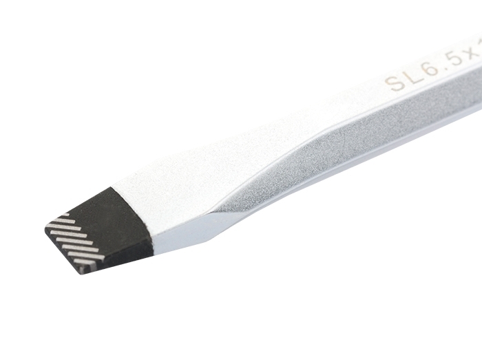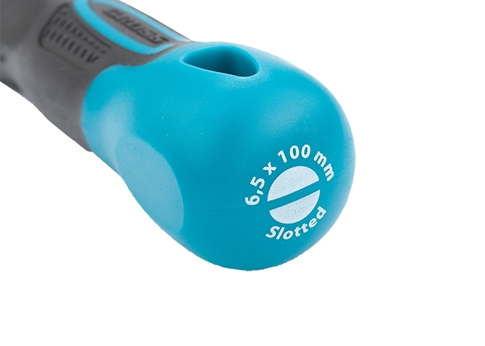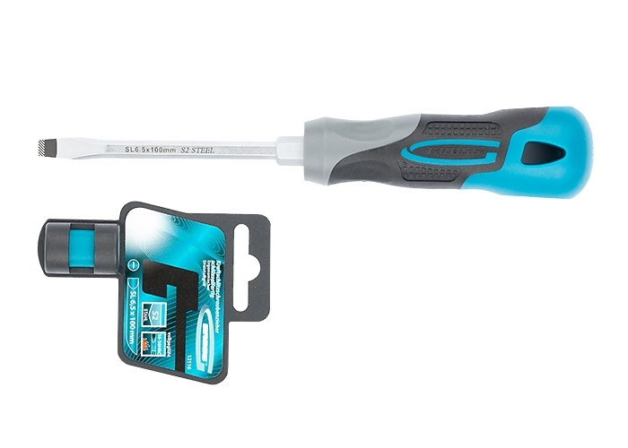 Отвертка торговой марки GROSS изготовлена из высококачественной инструментальной стали S2. Предназначена отвертка для монтажа/демонтажа резьбовых соединений с плоским типом шлица (SL6,5). Насечки на жале увеличивают трение между отверткой и шлицом крепежа, что исключает возможность повреждения шлица. На стержень отвертки длиной 100 мм нанесено хромовое защитное покрытие, которое защищает металл от коррозии. Трехкомпонентная рукоятка длиной 109 мм, имеющая запатентованную форму, удобно и надежно фиксируется в руке. Твердость рабочих частей отвертки (стержень, рукоятка) составляет 56 HRC, максимально крутящий момент затяжки — 6,5 H*m. Снабжена отвертка подвесной картой, удобной для размещения инструмента на стенде.
