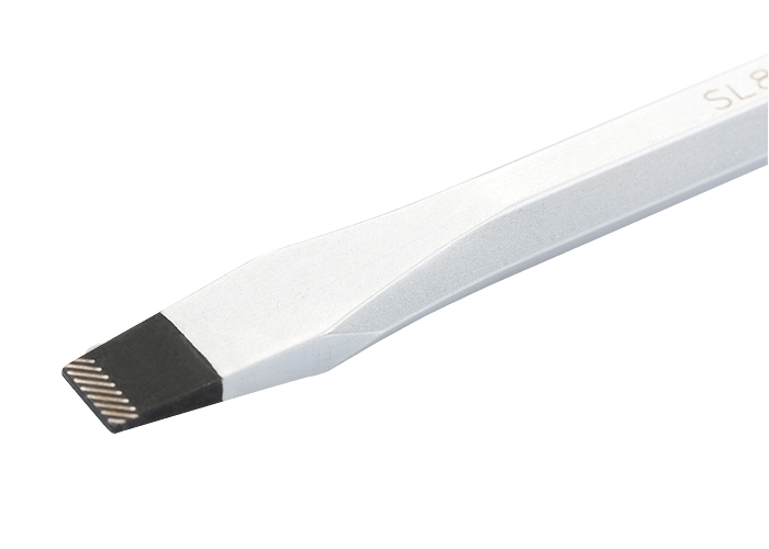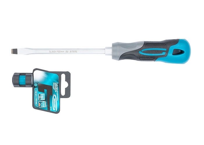 Отвертка торговой марки GROSS изготовлена из высококачественной инструментальной стали S2. Предназначена отвертка для монтажа/демонтажа резьбовых соединений с плоским типом шлица (SL8,0). Насечки на жале увеличивают трение между отверткой и шлицом крепежа, что исключает возможность повреждения шлица. На стержень отвертки длиной 150 мм нанесено хромовое защитное покрытие, которое защищает металл от коррозии. Трехкомпонентная рукоятка длиной 119 мм, имеющая запатентованную форму, удобно и надежно фиксируется в руке. Твердость рабочих частей отвертки (стержень, рукоятка) составляет 56 HRC, максимально крутящий момент затяжки — 11,5 H*m. Снабжена отвертка подвесной картой, удобной для размещения инструмента на стенде.
